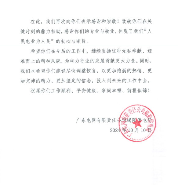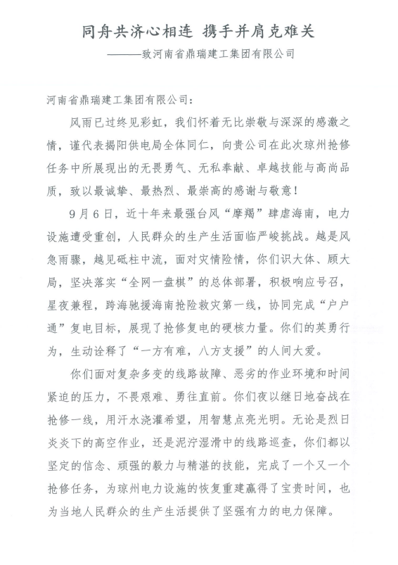 2024年海南遭遇強臺風“摩羯”襲擊期間,鼎瑞團隊星夜兼程,跨海馳援海南搶險救災一線,協同完成“戶戶通”復電目標,展現了鼎瑞搶修復電的硬核力量。廣東供電公司揭陽供電局在感謝信中進行了高度贊譽:“風雨已過終見彩虹,我們懷著無比崇敬與深深的感激之情,謹代表揭陽供電局全體同仁,向貴公司在此次瓊州搶修任務中所展現出的無畏勇氣、無私奉獻、卓 越技能與高尚品質,致以zui誠摯、zui熱烈、zui崇高的感謝與敬意!.....”。